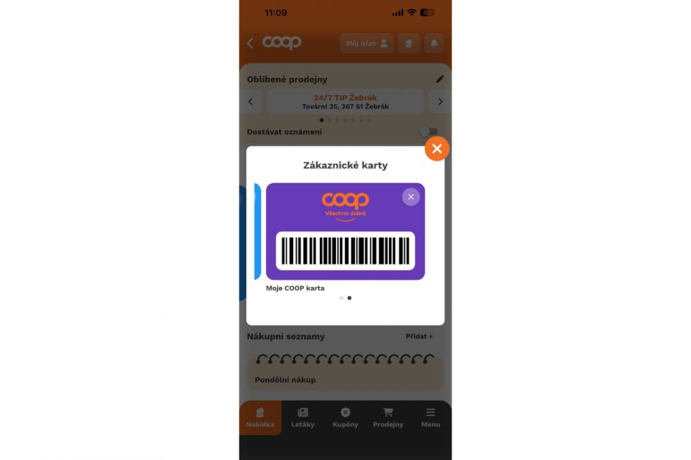 Karta je dostupná v sekci „Zákaznické karty“ v aplikaci a pro rychlé použití ji najdete i v pravém horním rohu aplikace pod ikonou karty.