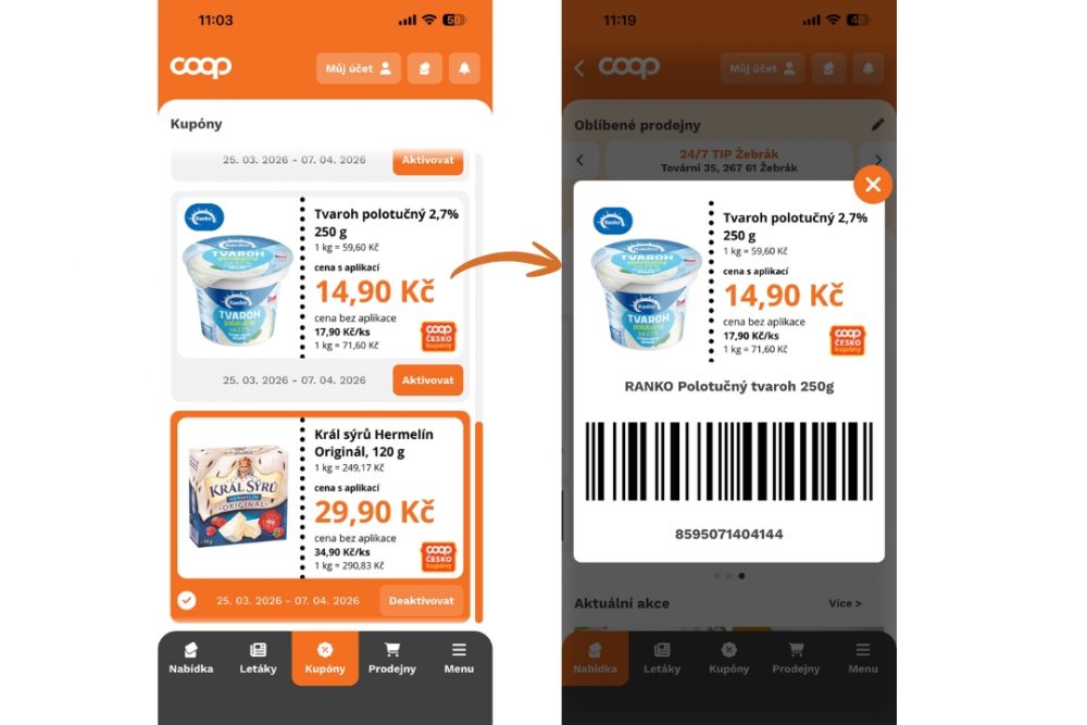 Stačí kliknout v sekci kupóny na kupón a zvolit „aktivovat“. Po aktivaci se zobrazí čárový kód, který naskenujete u pokladny a získáte slevu.