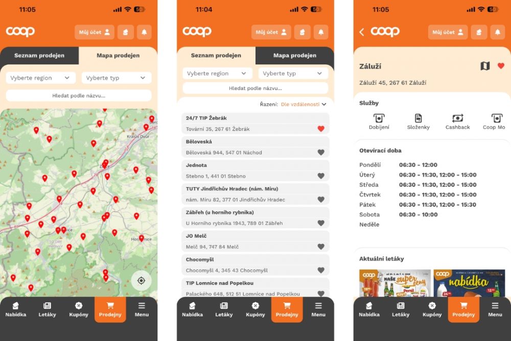 V sekci „Prodejny“ vyberte oblíbenou prodejnu či více oblíbených prodejen a zobrazí se všechny informace včetně otevírací doby.