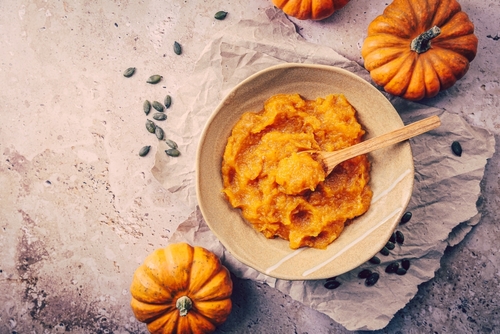 Dýni rozkrojíme, vydlabeme z ní semínka a dužinu omyjeme (nemusíme loupat). Očištěnou dýňovou dužinu nakrájíme na kostky a dáme je do hrnce. Zalijeme vodou, osolíme, přihodíme oloupaný česnek a necháme vařit asi 20 minut. Poté scedíme vodu, přilijeme teplé mléko, přihodíme kousek másla a rozmixujeme ručním tyčovým mixerem zcela na kaši. Dochutíme muškátovým oříškem a dosolíme podle chuti. Podáváme buď jako samotný pokrm nebo jako přílohu všude tam, kde máme ve zvyku použít bramborovou kaši.