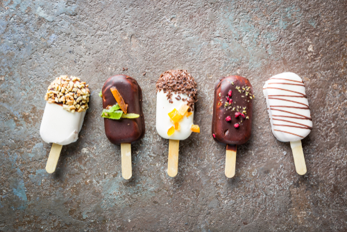 Dáme ji na chvilku ztuhnout do mrazáku (aby zůstala ještě tekutá, ale již začínala tuhnout). Poté ji přelijeme do formiček na nanuky a zapíchneme dřívko na držení nanuků. Necháme zcela zmrznout. Čokoládovou polevu ohřejeme buď v mikrovlnné troubě (1 minutu) nebo ve vodní lázni (2 až 3 minuty) a zmrzlé nanuky (vyndané z formiček) do takto rozehřáté polevy ponoříme. Obalíme v sekaných oříšcích či jiných posypkách a naposledy krátce uložíme do mrazničky.