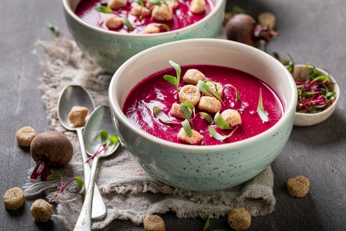 Řepu nakrájíme na kousky, oloupané brambory s cibulí na kostičky. Na oleji osmahneme cibuli, po chvíli přihodíme i brambory s červenou řepou. Opékáme asi 5 minut. Poté přidáme prolisovaný česnek a loupaná rajčata. Zamícháme a zalijeme zeleninovým vývarem. Vaříme zhruba 10 minut, pak rozmixujeme dohladka. Dochutíme solí, mletým pepřem, drceným kmínem a balzamikovým octem. Přidáme kousek másla. Ještě jednou promixujeme a nalijeme na talíře. Dáme trochu bílého jogurtu nebo zakysané smetany a ozdobíme čerstvými bylinkami a krutony podle chuti. Ihned podáváme.