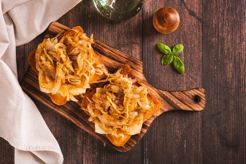 Začneme nakrájením cibule na tenké půlměsíčky. Vhodíme je do kastrůlku s máslem a olejem. Osolíme a restujeme asi 15 minut doměkka. Přisypeme cukr a necháme krátce zkaramelizovat. Poté zakápneme balzamikovým octem a dáme ještě probublat. Toastové chleby rozložíme na plech s pečicím papírem a vložíme do trouby vyhřáté na 200 °C předpéct nasucho na 2 minuty. Poté na ně poklademe sýr a cibulku. Opepříme, posypeme tymiánem a vrátíme do trouby, kde pečeme asi 8 minut. Horké toasty ihned podáváme.