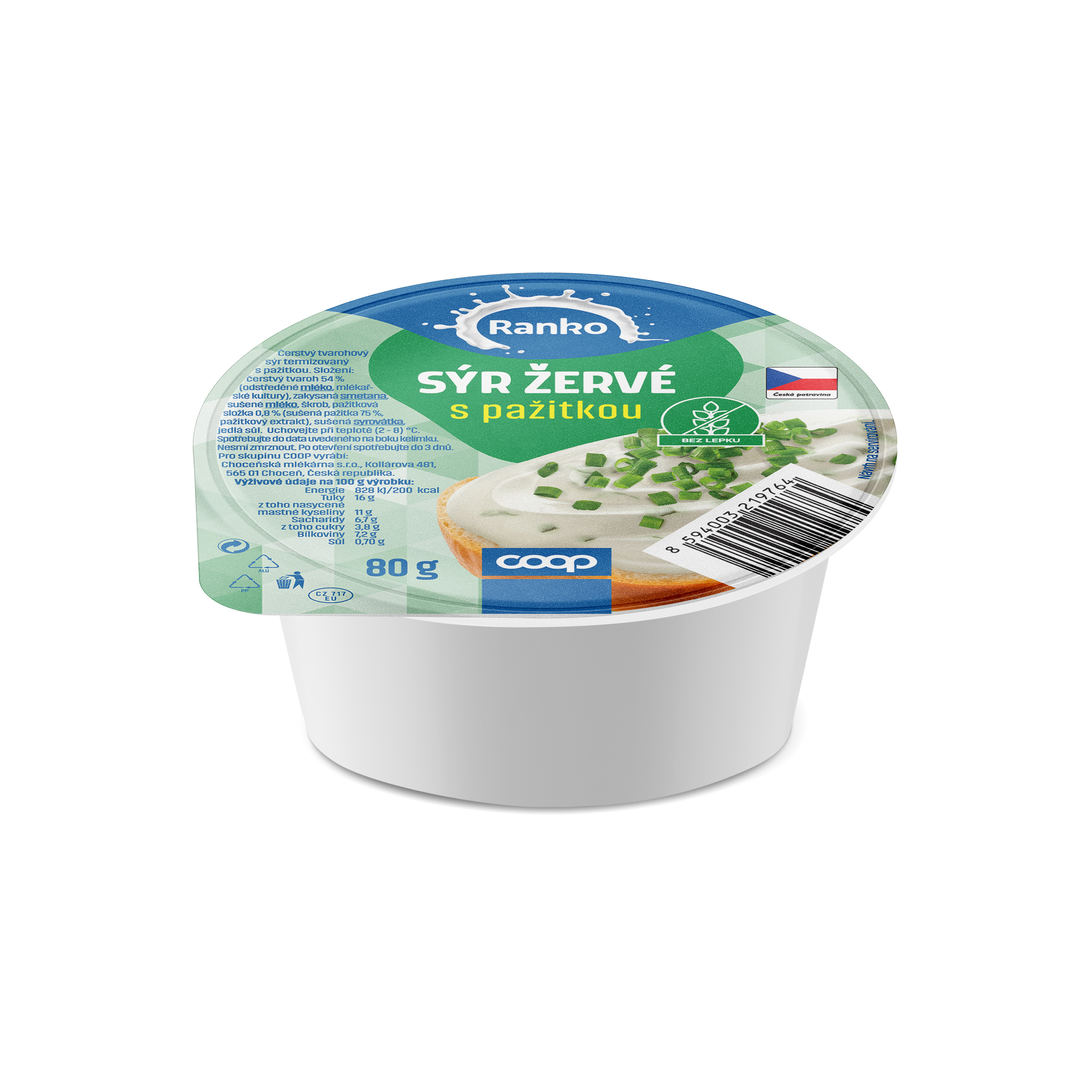 Čerstvý tvaroh (54 %) vyrobený z odstředěného mléka a mlékařských kultur, zakysaná smetana, sušené mléko, škrob, pažitková složka (0,8 % – tvořená ze 75 % sušenou pažitkou a doplněná pažitkovým extraktem), sušená syrovátka a jedlá sůl.