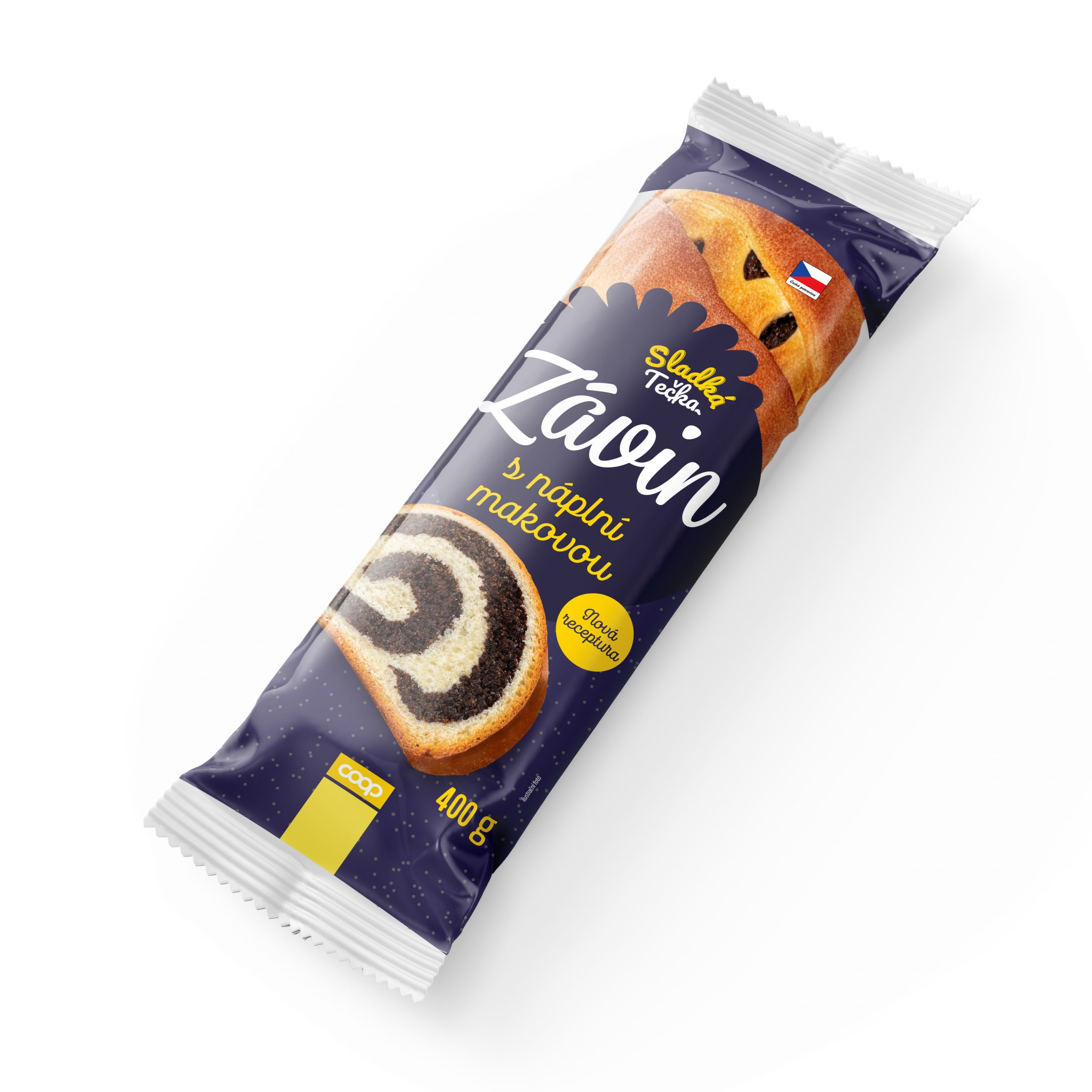 náplň maková 35 % [voda, mák 32 %, ovocná náplň (cukr, jablečný protlak, voda, kyselina: kyselina citronová; želírující látka: pektiny; aroma), směs (pšeničná mouka, modifikovaný škrob, sušený vaječný bílek, regulátor kyselosti: kyselina citronová; aroma), cukr, sirup (glukózo-fruktózový sirup, cukr, voda), konzervant: kyselina sorbová], pšeničná mouka, voda, cukr, řepkový olej, droždí, sirup (glukózo-fruktózový sirup, cukr, voda), vaječná melanž (vaječná melanž, jedlá sůl), sůl s jódem (jedlá sůl, jodičnan draselný), přípravek [pšeničná mouka, enzymy (obsahují pšenici), látka zlepšující mouku: kyselina L-askorbová], pšeničný lepek, konzervant: kyselina sorbová.